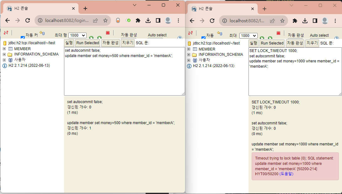 만약 timeout때 까지 끝까지 락을 안돌려주면? 기다리던 쪽에서 락 타임 오류가 발생한다.