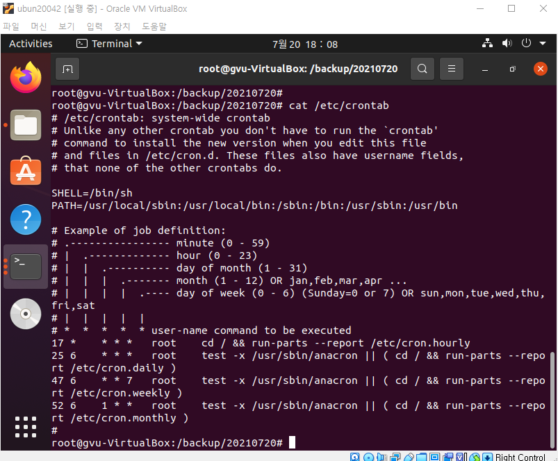 /etc/crontab 를 수정해서 어떤 명령어를 언제 실행할 지 예약할 수 있음. 최대 주기, 최소 분 단위로 선택 가능. shell이랑 조합하면 더 다양한 걸 할 수 있겠지.