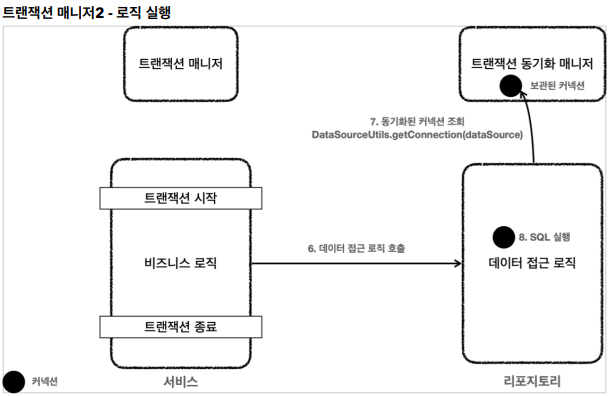 서비스에서 레퍼지토리한테 보관하거나 변경하라는 명령을 실행하면 레퍼지토리에서 로직을 실행할 때 매니저에서 커넥션을 찾아본다. 있으면 해당 커넥션 가지고 작업을 수행한다.