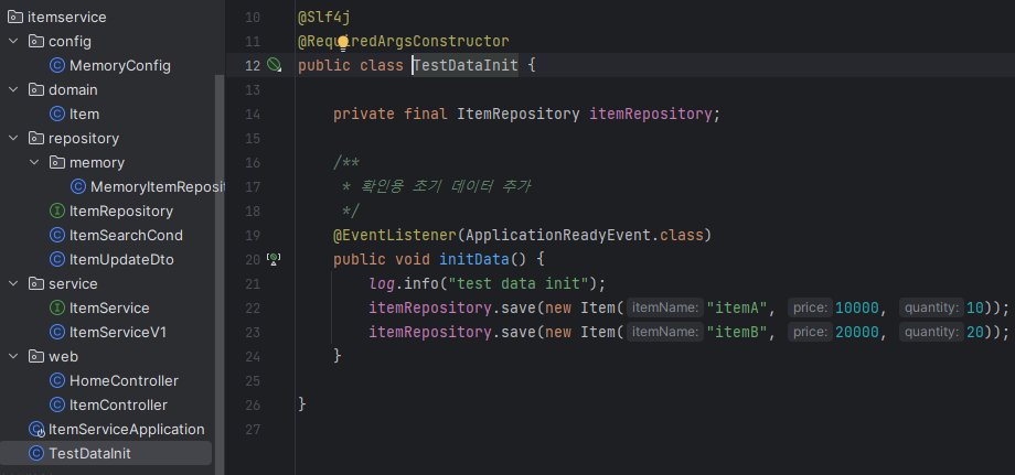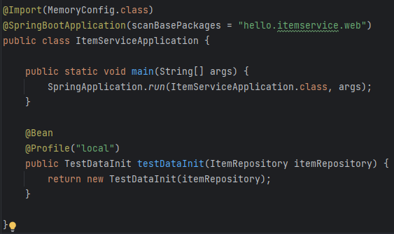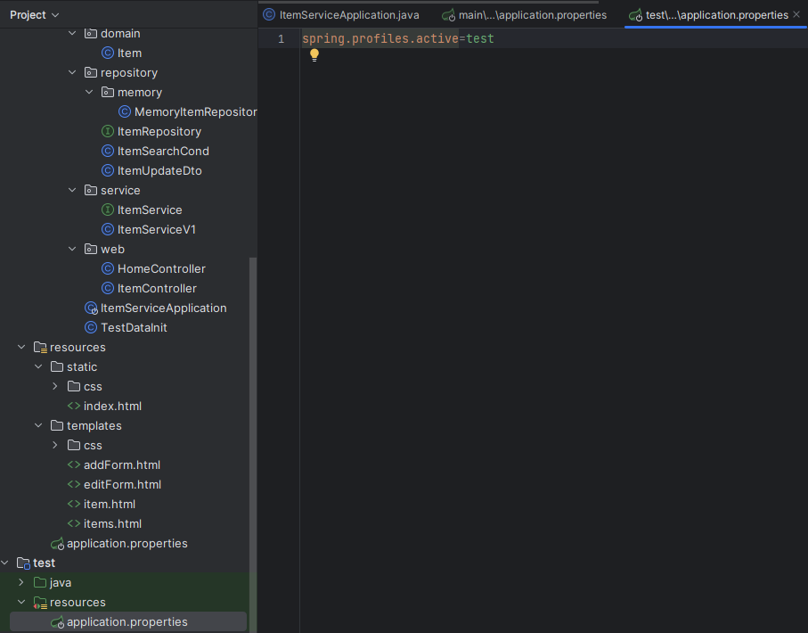 실행할 때 프로필을 "local"로 설정해놔서 메인 함수에 만약 프로필이 "local"일 경우 테스트를 위한 아이템을 미리 만들어놓으라는 식으로 부여할 수 있다. 테스트할 때는 미리 만들어놓지 않게끔 테스트 패키지 밑에 따로 만든 모습이다.