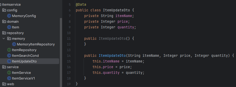 ItemUpdateDto updateParam = new ItemUpdateDto("item2", 20000, 30);