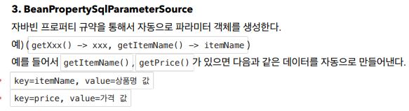 Map의 경우는 별거없이 걍 Map을 사용한거고, MapSqlParameterSource는 Map과 유사하지만 sql 타입을 지정할 수 있는 등 좀 더 특화된 기능을 제공한다. BeanPropertySqlParameterSource는 인터페이스인 SqlParamterSource를 구체화하여 스프링이 해당 클래스를 보고 적절하게 param을 생성한다고 보면 된다. 객체의 자바 빈 규약으로 이름 및 함수가 규칙을 통해 만들어진다는 것을 활용해 Map에서 만든것을 자동으로 만들어주는 거다. 예를들어 해당 객체의 속성에 name, price가 있으면 이걸 lombok을 통하든 뭘 하든 name과 price를 얻는 함수 이름은 getName(), getPrice()일 것이고 이걸 사용해 Map에 자동으로 Map.of({"name", getName()}, {"price", getPrice()}) 같은 코드를 자동으로 작성해서 주는거다.