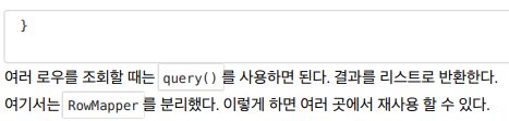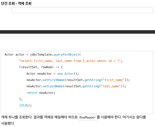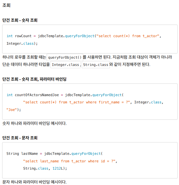 사용법은 하나의 row를 조회하는 단건 조회는 queryForObject를 사용하고 반환하는건 sql문의 결과에 따라 단순 숫자, string, 객체를 반환할 수도 있다.