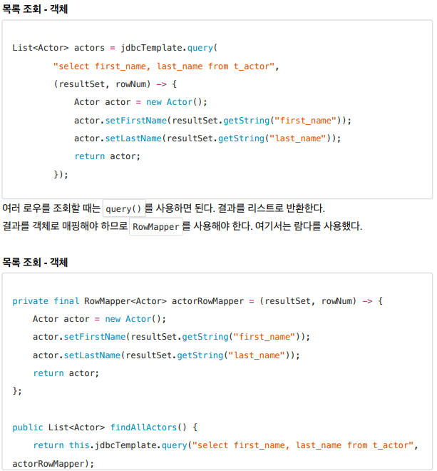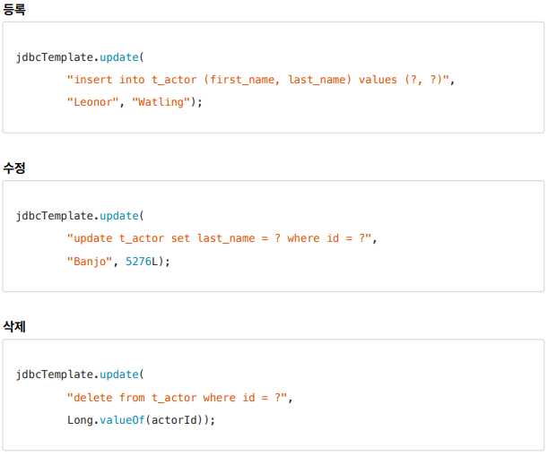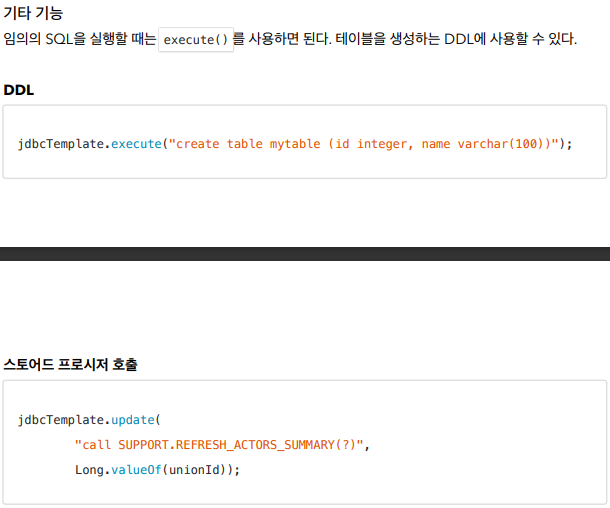 기타로는 execute라는게 있는데 jdbcTemplate가 사전에 정의한 함수 외에 db의 기능을 사용하고 싶을 때.