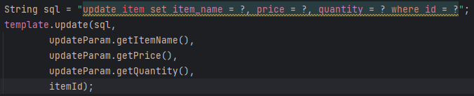 String sql = "update item set item_name = ?, price = ?, quantity = ? where id = ?";