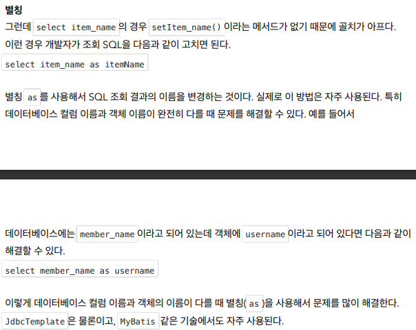 RowMapper를 보면 db의 컬럼에다가는 snake로 저장했는데 camel로 자동으로 바꿔서 지원해주는것도 확인할 수 있다. 이런 문제가 생긴 이유는 자바는 camel case를 사용하고 db는 대소문자를 구별하지 않기 때문에 snake case를 사용해서 불러올 때 이름이 다른 문제가 있었다. 그래서 만약 직접 sql문을 사용해서 불러올 땐 item_name as itemName으로 사용해도 되고, BeanPropertyRowMapper가 자동으로 해준다.