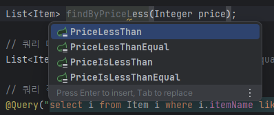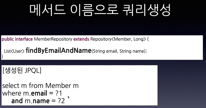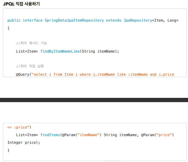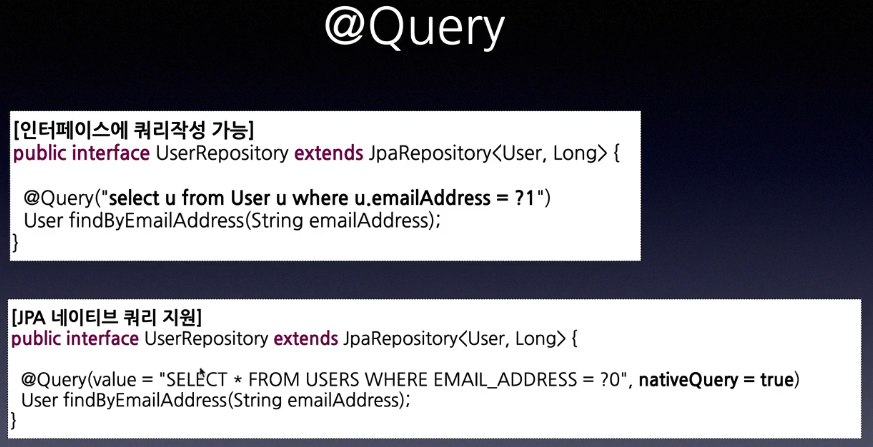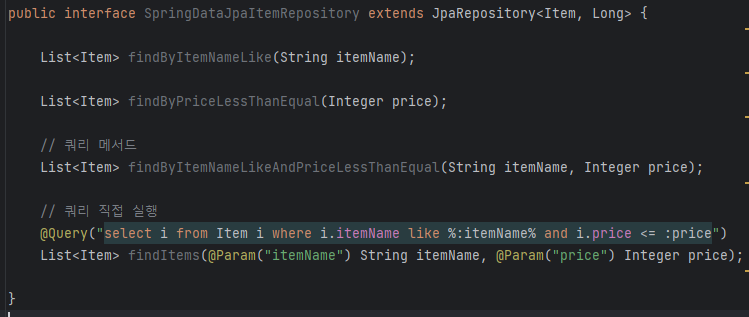진짜 함수 이름만으로도 사용가능한데, 이름만으로는 안되는 더 복잡한 쿼리나 함수 이름이 너무 길어서 걍 직접 치는것들은 @Query로 감싸서 할 수 있고, 후에 나올 Querydsl을 사용해도 된다.