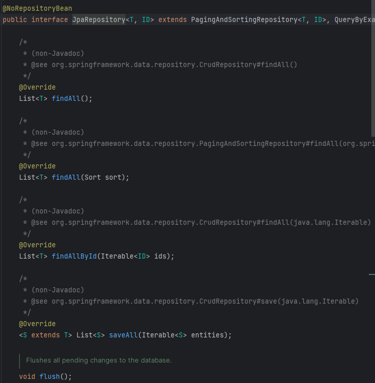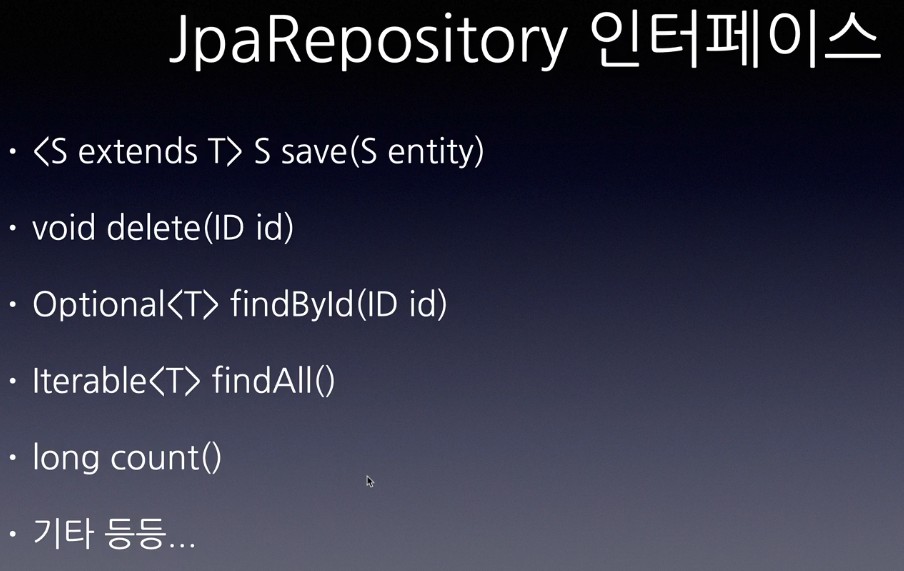 정의하는 방법은 extends로 인터페이스 확장에 객체, 그 객체 pk의 타입을 적어주면 된다. 이름만으로도 함수를 정의해서 사용할 수 있다. 규칙은 있지만 IDE에서 어느정도 자동완성 해준다. 다만 쿼리까지 지원해주지만 조인도 안되서 실무에서 이것만 사용하기엔 단순하기 때문에 querydsl을 사용한다. findAll같은 어디에나 당연히 있을법한 함수들은 직접 정의하지 않아도 JpaRepository로 이미 있다.
