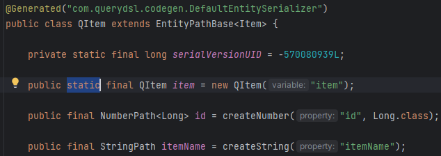 여기서 QItem은 자기 자신을 객체로 반환하는 static 함수가 있다. 이걸 사용하면 new 하는 부분 줄일 수 있고, static import 하면 클래스 이름도 줄일 수 있다.
