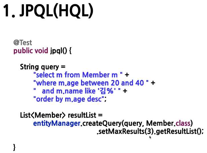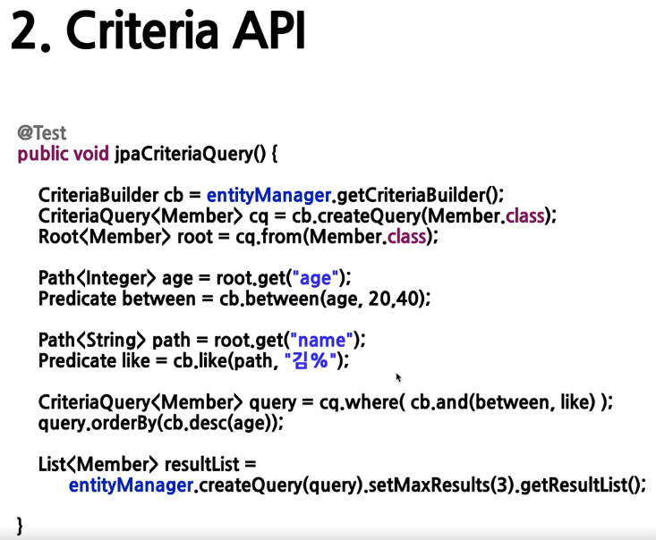 그럼 전까지 봤던 ORM이 자동으로 sql을 만들어서 하는건 알겠는데, 자동으로 작성하는 방법이 자기도 sql 문자로 변환해서 하던가, 아주 타입을 아주 어렵게 지정해서 하는 예전 EJB급이 있다.