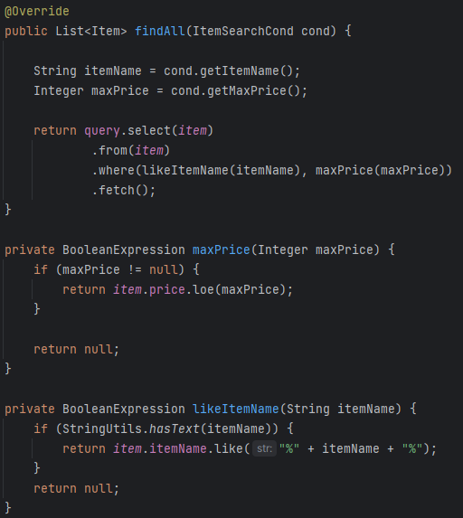 근데 저 동적쿼리용 코드를 더 줄일 수 있다. builder를 정의해서 and로 추가하는 대신 BooleanExpression을 사용해도 된다.