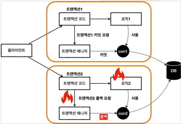 만약 외부에서 롤백이 일어난 경우, 내부로써 가상으로 트랙잭션을 가지고 있는 애가 아무리 커밋을 해도 가짜라 어차피 물리적 트랜잭션을 가지고 있는 애가 롤백을 하니까 안의 것 까지 전부 롤백된다.