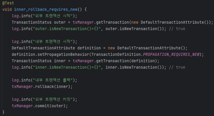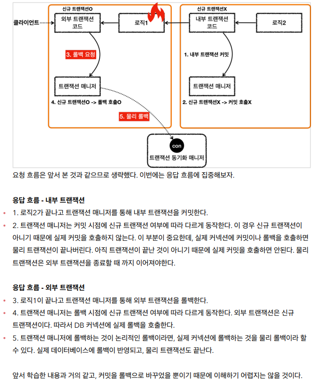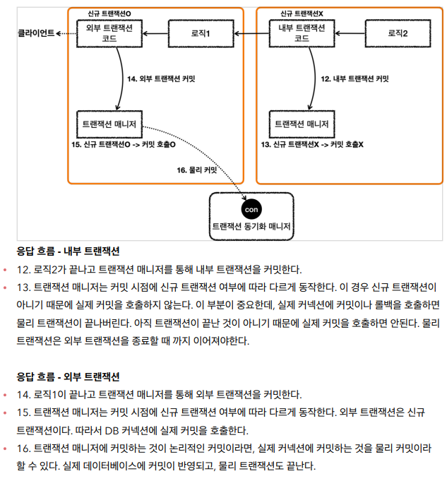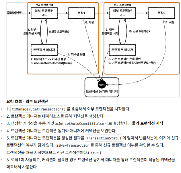 사실은 내부 트랜잭션은 한다고 해놓고 아무것도 안해야 위에서 말한 방식을 수행할 수 있다. 그래야 내부에서 커밋을 하더라도 뭐 있는게 없으니 커밋이 안되서 물리적으로 변화는 없고, 외부에서 해야 아까 내부에서 적용한 내용들까지 같이 적용되며 커밋 되야 하는게 맞다. 그래서 가상으로 트랜잭션이 수행되는 것처럼 속인 것. 자기가 외부인지 아닌지는 isNewTransaction()으로 알 수 있다. 매니저가 실제 트랜잭션 동기화 매니저랑 커넥션 요청 해본다음 이미 누가 점유하고 있는지 여부로 기억하는 것.