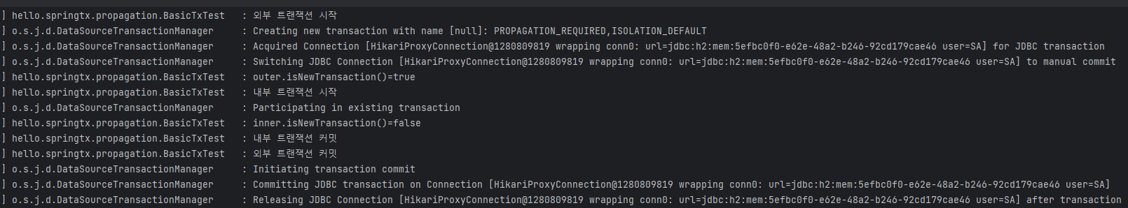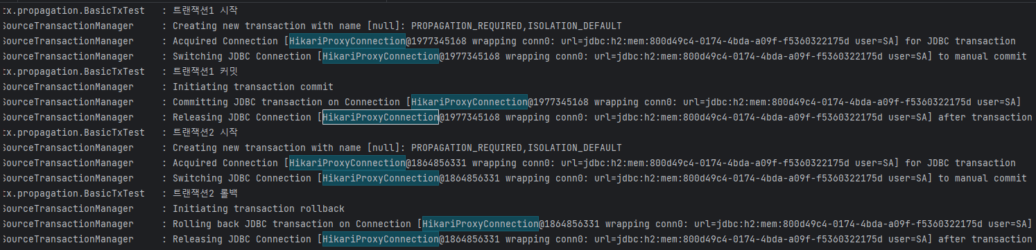 배웠던 대로 hikari 커넥션 풀에서 커넥션 하나 빌려와서 새로운 트랜잭션을 가져올 때 시작하고 커밋 및 롤백도 잘 된다.