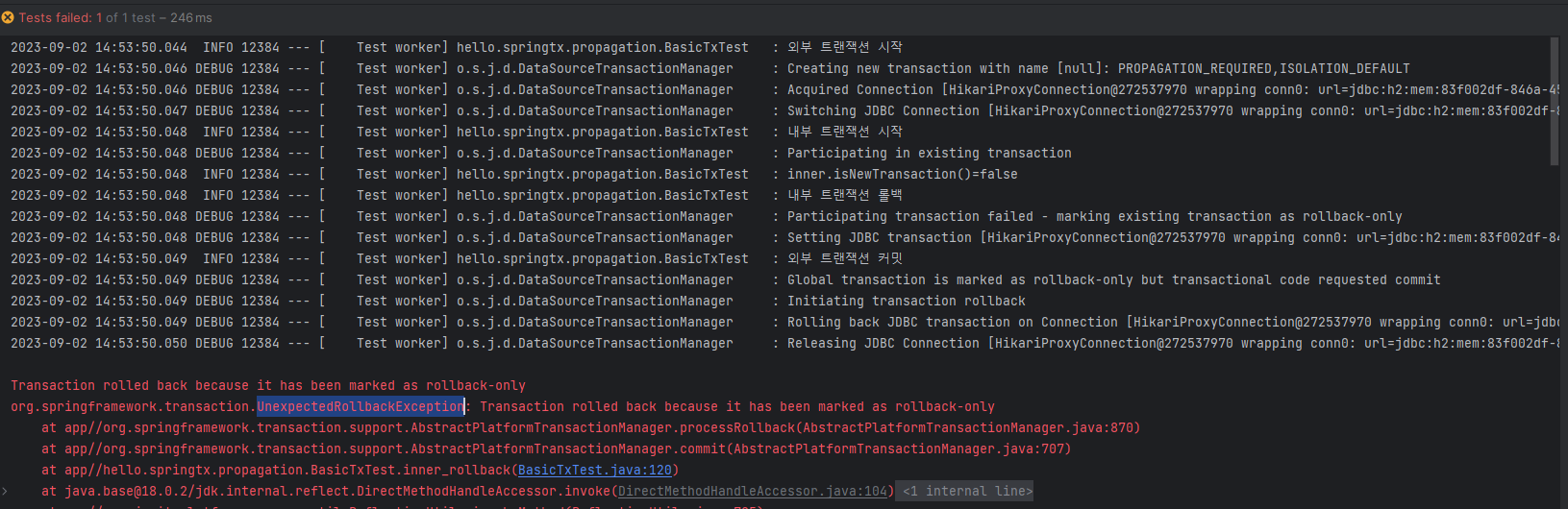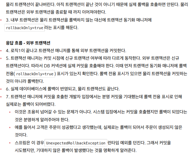 만약 내부에서 하나라도 롤백이 나왔을 경우, 트랜잭션 동기화 매니저에서 rollbackOnly를 true로 설정하고 계속 진행한다. 애초에 롤백이 나왔다는건 안에서 문제가 발생했으므로 실제 db에 반영이 되면 안되므로 그걸 막는것이다. 그래서 외부에서 커밋을 했을 때 트랜잭션 동기화 매니저 확인 후 이미 rollback only로 설정되어 있어서 커밋할 수 없다고 에러를 발생 시키는 것.