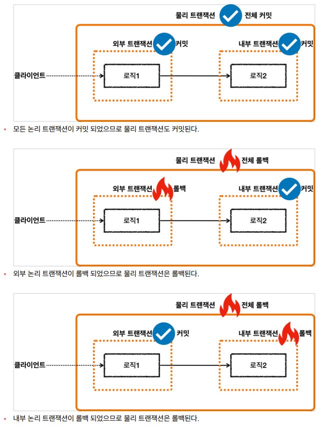 기본적인 원칙은 모든 논리 트랜잭션이 커밋되어야 물리 트랜잭션이 커밋되고, 하나라도 롤백되면 전부 롤백되는 것.