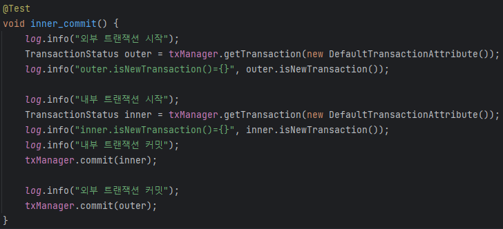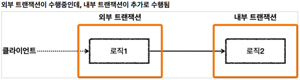 외부 트랜잭션에서 먼저 시작하고 아직 commit을 해서 트랜잭션을 끝마치치 않았는데 한번 더 트랜잭션을 실행한다. 코드 상 외부 내부가 구분 되니까 이렇게 부르는 듯.