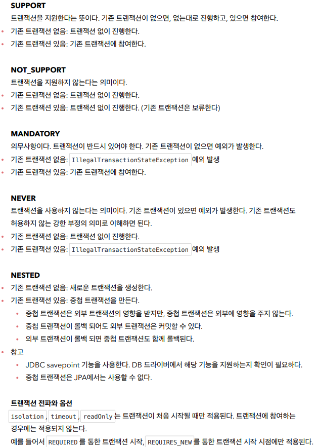 나머지 옵션도 있긴한데 사실 대부분 REQUIRED만 사용하고 아주 가끔 REQUIRED_NEW를 사용하는 정도라.. 그냥 있다는 것만 알아두고 필요할 때 찾아보면 된다.