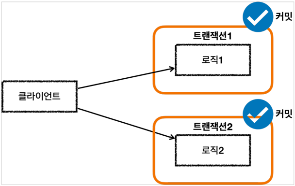 스프링의 경우 기본 옵션으로 이 두 트랜잭션을 하나의 트랜잭션으로 묶어서 만들어준다. 또 이해를 위해 이걸 물리 트랜잭션, 논리 트랜잭션으로 나눠서 정의한다.