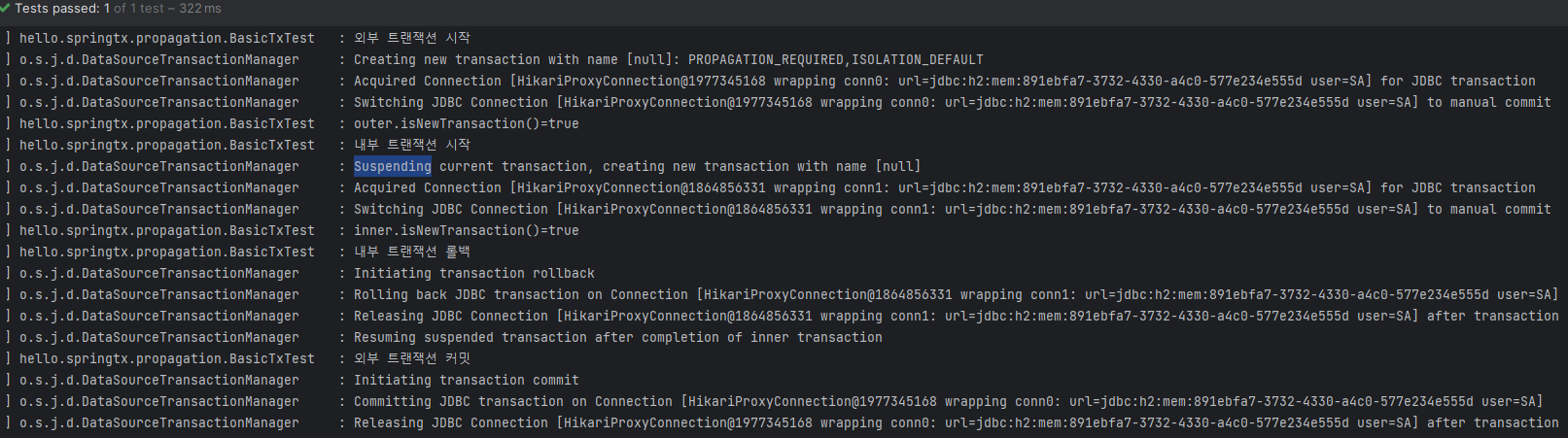 보면 트랜잭션을 가져오는 척 하는게 아니라 외부 트랜잭션을 미루고 새로운 커넥션을 가져오며 진짜 트랜잭션을 새로 만드는걸 볼 수 있음.