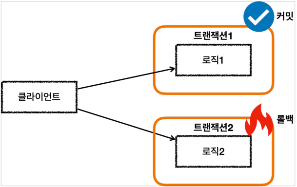 하나의 커넥션 가지고 하는게 아니라 진짜 따로따로 하고 싶을 때도 있을텐데 이건 requires_new 옵션을 사용하면 된다. 이러면 내부에서 롤백해도 외부에선 커밋되는 등 따로따로 작용한다.
