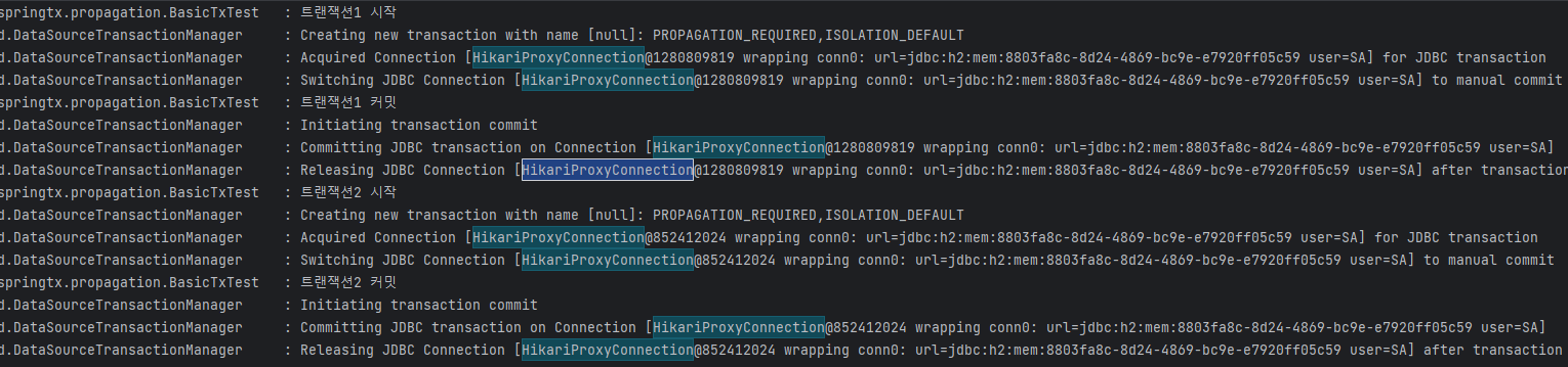 각자 다른 트랜잭션으로 커밋하고 있다. 근데도 잘 보면 같은 커넥션 conn0을 다 사용하는걸 볼 수 있다. 하지만 주소값은 다르다.