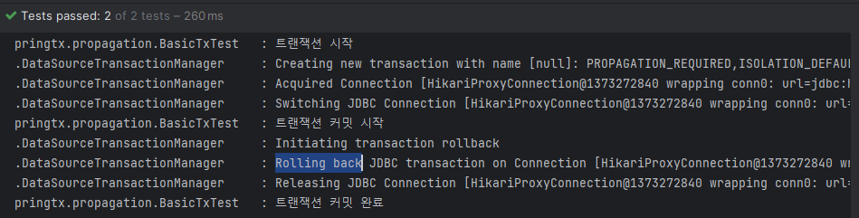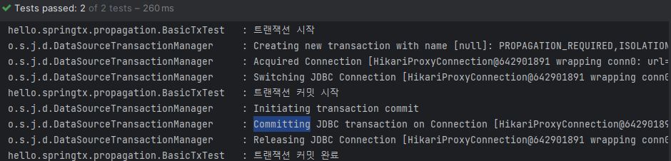 배웠던 대로 hikari 커넥션 풀에서 커넥션 하나 빌려와서 새로운 트랜잭션을 가져올 때 시작하고 커밋 및 롤백도 잘 된다.