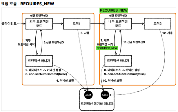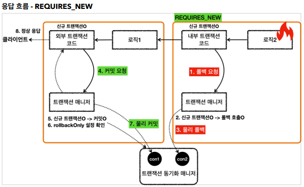 하나의 커넥션 가지고 하는게 아니라 진짜 따로따로 하고 싶을 때도 있을텐데 이건 requires_new 옵션을 사용하면 된다. 이러면 내부에서 롤백해도 외부에선 커밋되는 등 따로따로 작용한다.
