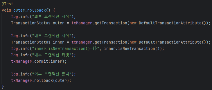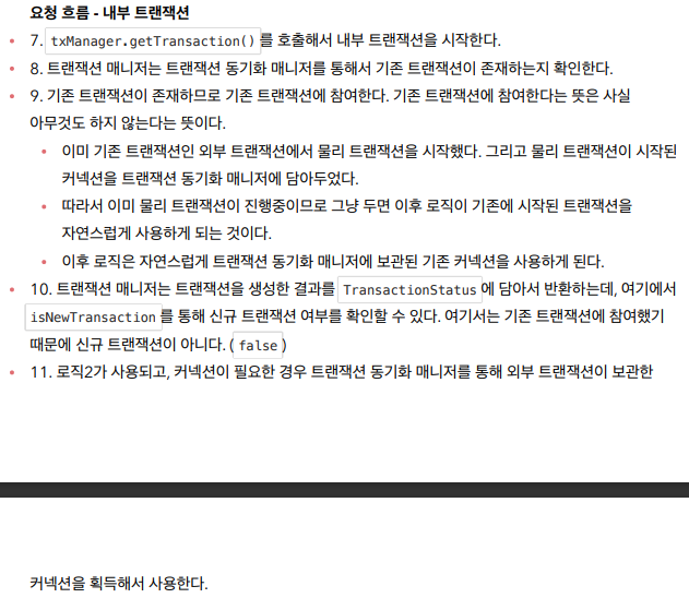 사실은 내부 트랜잭션은 한다고 해놓고 아무것도 안해야 위에서 말한 방식을 수행할 수 있다. 그래야 내부에서 커밋을 하더라도 뭐 있는게 없으니 커밋이 안되서 물리적으로 변화는 없고, 외부에서 해야 아까 내부에서 적용한 내용들까지 같이 적용되며 커밋 되야 하는게 맞다. 그래서 가상으로 트랜잭션이 수행되는 것처럼 속인 것. 자기가 외부인지 아닌지는 isNewTransaction()으로 알 수 있다. 매니저가 실제 트랜잭션 동기화 매니저랑 커넥션 요청 해본다음 이미 누가 점유하고 있는지 여부로 기억하는 것.