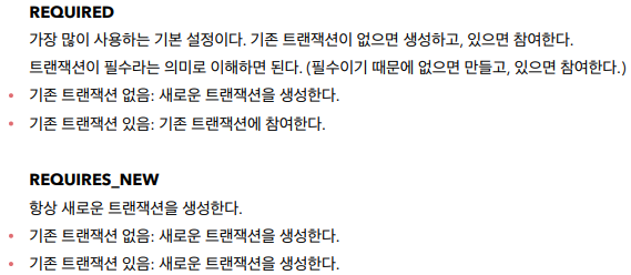나머지 옵션도 있긴한데 사실 대부분 REQUIRED만 사용하고 아주 가끔 REQUIRED_NEW를 사용하는 정도라.. 그냥 있다는 것만 알아두고 필요할 때 찾아보면 된다.