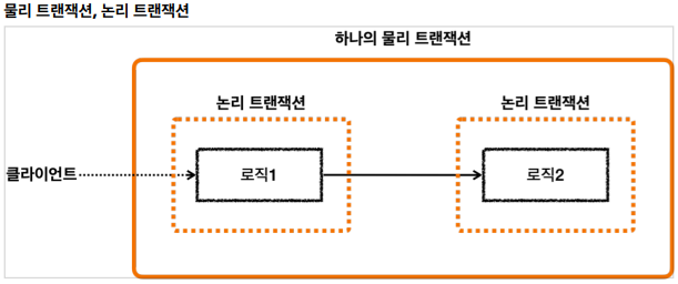 스프링의 경우 기본 옵션으로 이 두 트랜잭션을 하나의 트랜잭션으로 묶어서 만들어준다. 또 이해를 위해 이걸 물리 트랜잭션, 논리 트랜잭션으로 나눠서 정의한다.