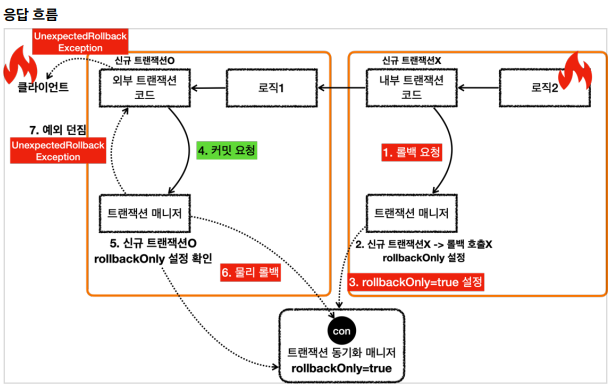만약 내부에서 하나라도 롤백이 나왔을 경우, 트랜잭션 동기화 매니저에서 rollbackOnly를 true로 설정하고 계속 진행한다. 애초에 롤백이 나왔다는건 안에서 문제가 발생했으므로 실제 db에 반영이 되면 안되므로 그걸 막는것이다. 그래서 외부에서 커밋을 했을 때 트랜잭션 동기화 매니저 확인 후 이미 rollback only로 설정되어 있어서 커밋할 수 없다고 에러를 발생 시키는 것.