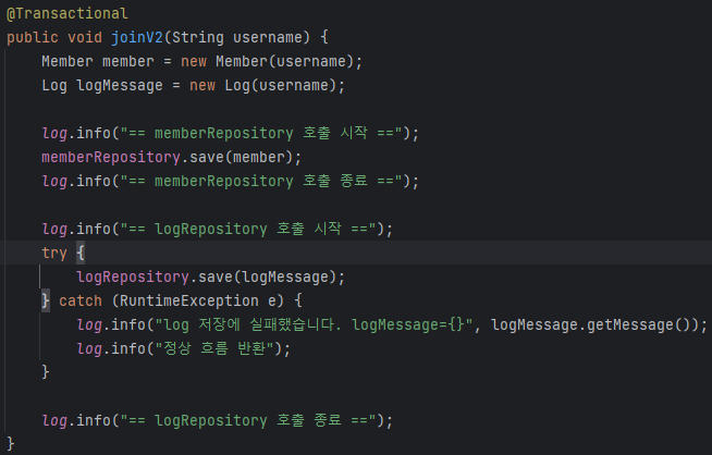 멤버 저장은 되지만 로그에서 에러 떴을 때 그냥 try catch해서 서비스에서 정상 흐름으로 바꾸면 제대로 되는것 아닌가? 생각할 수있다. 하지만 큰 실수다.