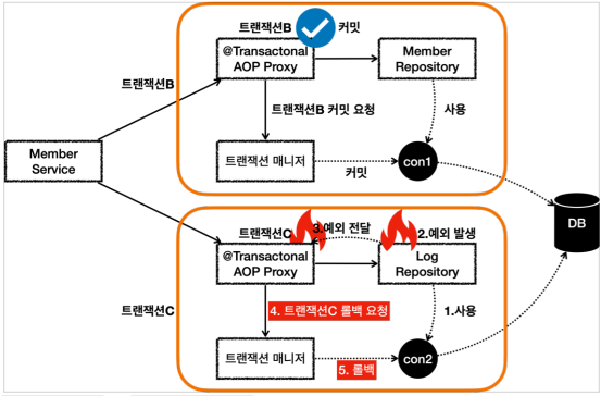 서비스에서 트랜잭션을 시작하여 서비스가 물리 트랜잭션을 가지고 있고 이 커넥션 하나 가지고 내부 트랜잭션들을 수행할 텐데 하나라도 예외가 났을 시 메니저에 rollbackOnly를 true를 바꾸기 때문에 try catch로 잡아서 정상 흐름으로 바꾸고 commit하려고 해도 rollbackOnly 때문에 커밋하지 못하고 예외를 발생시킨다. 결과 db에는 롤백되어 반영되지 않고 회원가입은 롤백되어 없던게 된다.