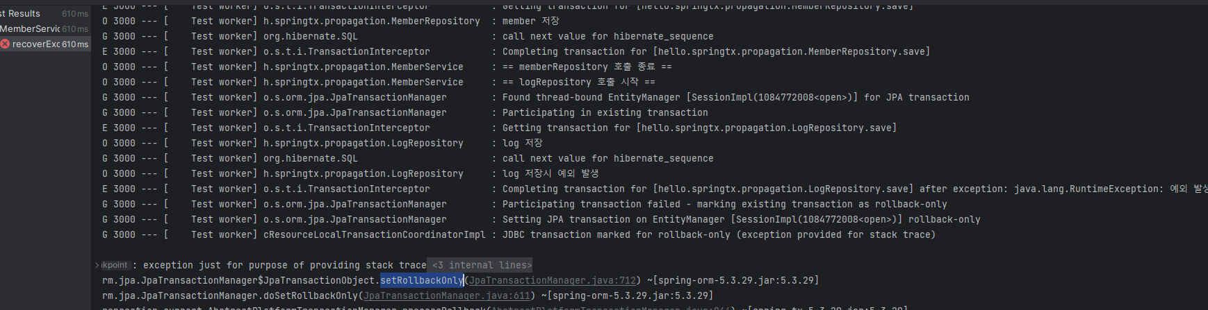 만약 로그부분에서 런타임 예외가 발생해서 롤백할 경우를 보자.