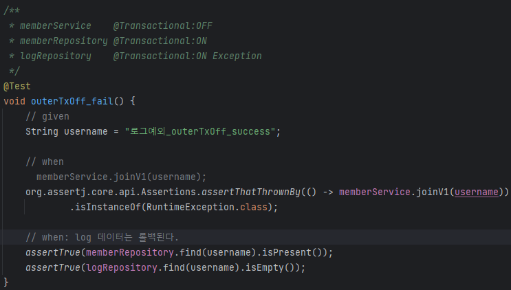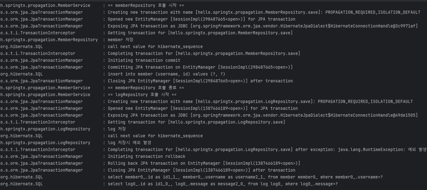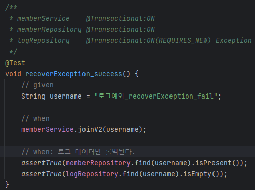 멤버는 정상이라 commit되서 db에 남지만 로그는 예외가 나와서 rollback되어 남지 않게 된다.