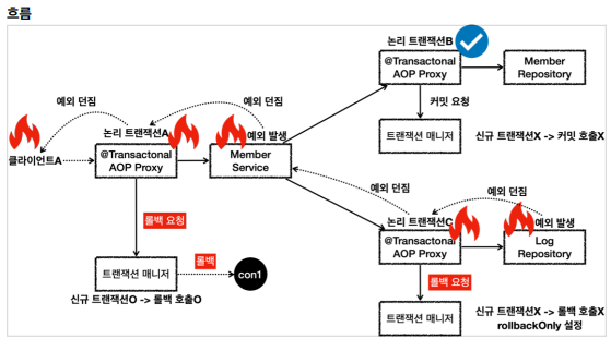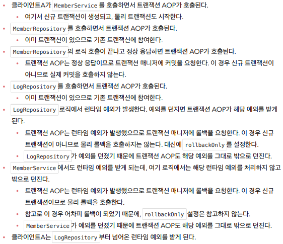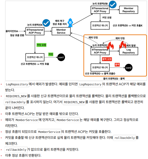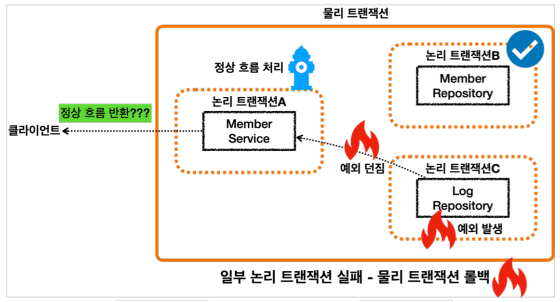 어차피 내부 트랜잭션은 가상이라 롤백 날려도 반영되지 않고 rollbackOnly를 true로 설정하지만, 외부 트랜잭션에서 롤백한다. 근데 이 롤백이 자기가 commit을 날리고 해서 롤백이 발생하는게 아니라 런타임 예외로써 롤백이 되는것이기 때문에 어차피 rollbackOnly를 참고하지 않고 롤백한다는 것이 조금 헷갈릴 수 있다.