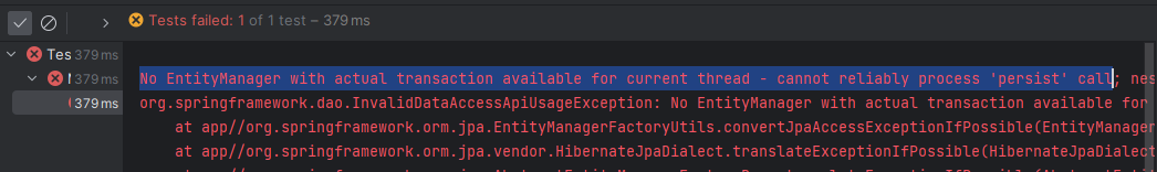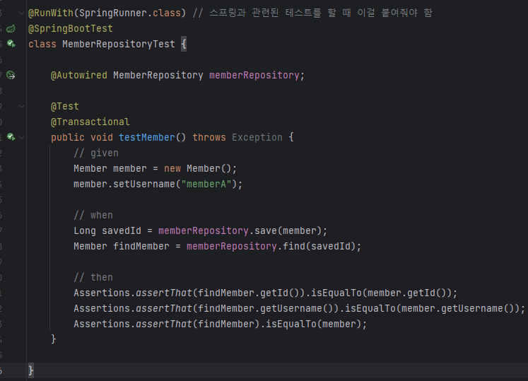 @Transactional 없이 하면 트랜잭션이 없다고 테스트가 안된다. 이건 실습편이라 이론편 보면 안다고 함.