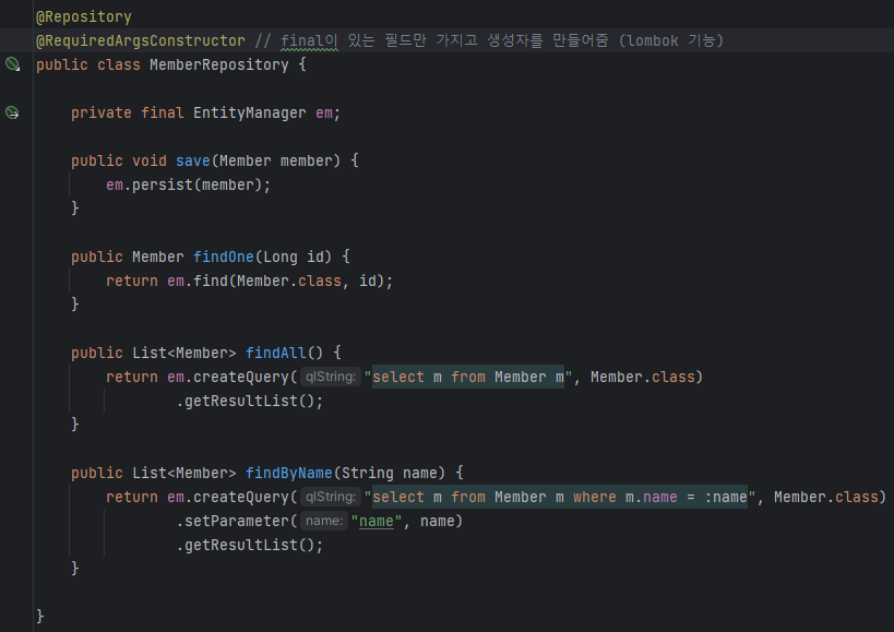 EntityManager를 저렇게 정의만 해도 lombok이 final 붙은건 가져오기끔 @RequiredArgsConstructor를 한다. 사실 이걸 위해 @Autowired쓰고 아니면 생성자에 붙이고.. 해야 되는데 계속 더 간단한 방법이 나온다.