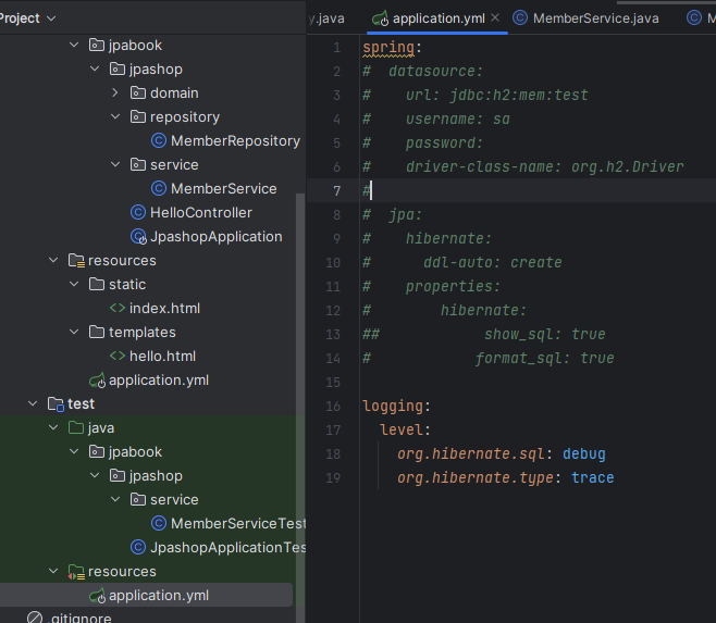 실제 db를 사용하는것이 아닌 인메모리 테스트를 위해, 즉 실제 product 실행 환경과 테스트 환경 db를 분리하기 위해 test쪽에도 application 설정 파일을 만들어준다. 원래 h2:mem:test와 같이 메모리에서 돌린다는걸 명시해야 하지만 테스트 환경에선 메모리 테스트가 기본값이기 때문에 생략해도 된다.