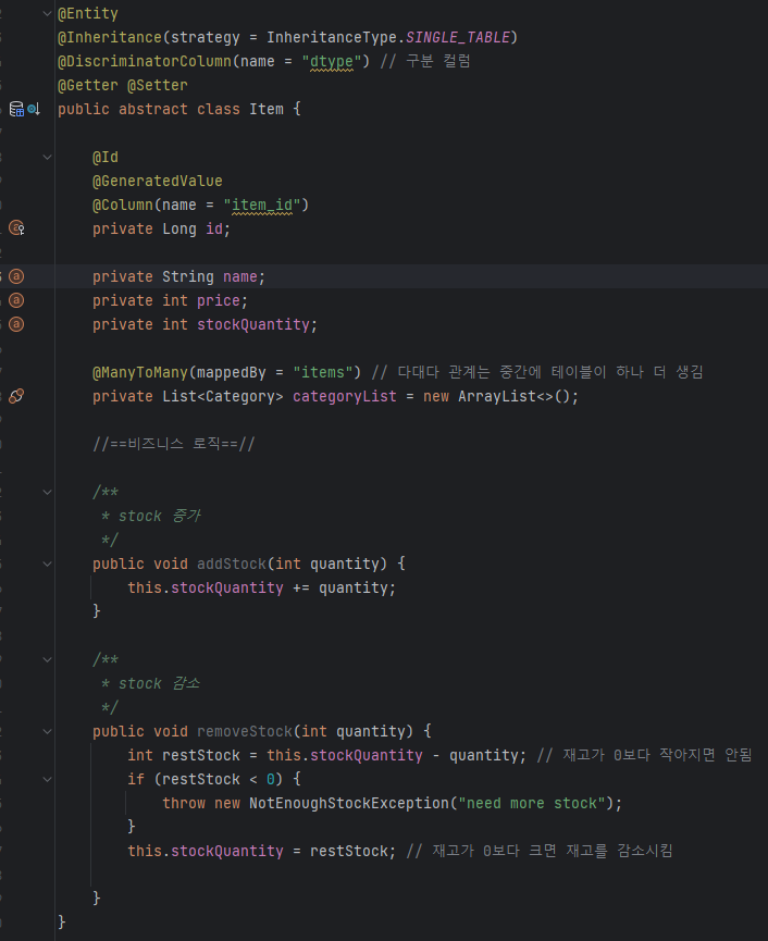 처음 보는 개념으론 서비스가 아니고 왜 엔터티에 함수를 넣느냐이다. 이유는 엔터티 안의 변수를 직접적으로 다루는 거는 엔터티의 함수로 남겨놔야 유지보수가 편하다는 짬 섞인 경험이다. 그리고 좀 더 직관적이기도 하고.
