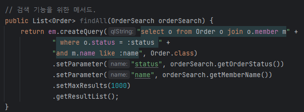 // public List<Order> findAll(OrderSearch orderSearch) {} // 검색 기능을 위한 메서드.