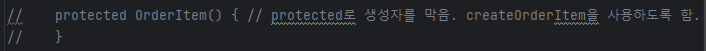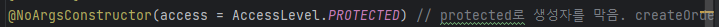 @NoArgsConstructor(access = AccessLevel.PROTECTED) // protected로 생성자를 막음. createOrder를 사용하도록 함.