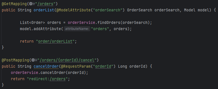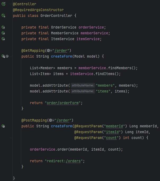 주목할 부분은 orderService에서 order를 받을 때 객체를 받는게 아닌 id 값 등의 고유 값을 가져오는 것. 이게 더 안전한 것도 있고 orderService 안에 order 객체 말고 다른것들도 막 들어오면 좀 불안해지는게 있다. 또 id를 받아오도록 하는 것이 테스트 할 때도 좋다.