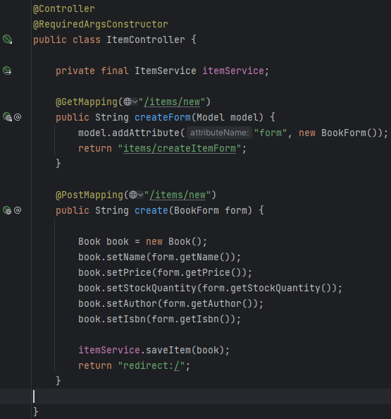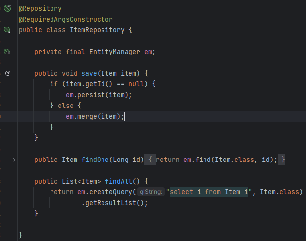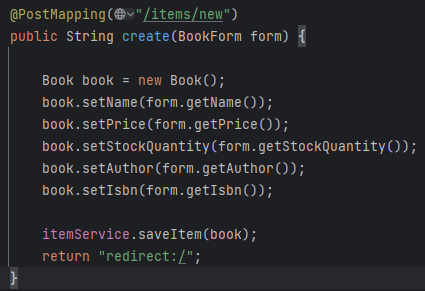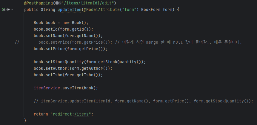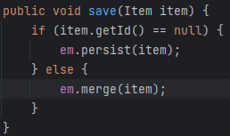 새로운 아이템을 만든다고 new를 만들고 그 객체에 속성을 넣어가며 만드는 모습이다. 하지만 여기엔 그냥 쌩으로 내가 만들어서 하는것이기 때문에 추적하는 객체는 당연히 없을 것이고, 그러므로 save같은거 없이 @Transactional이 끝난다고 해도 뭐 변경을 추적할 수 있는게 없으니까 반영되지 않는다. 그래서 변경이라도 굳이 saveItem으로 저장 해주는 것. 하지만 여기서 saveItem을 하면 merge하도록 짜놓았다.
