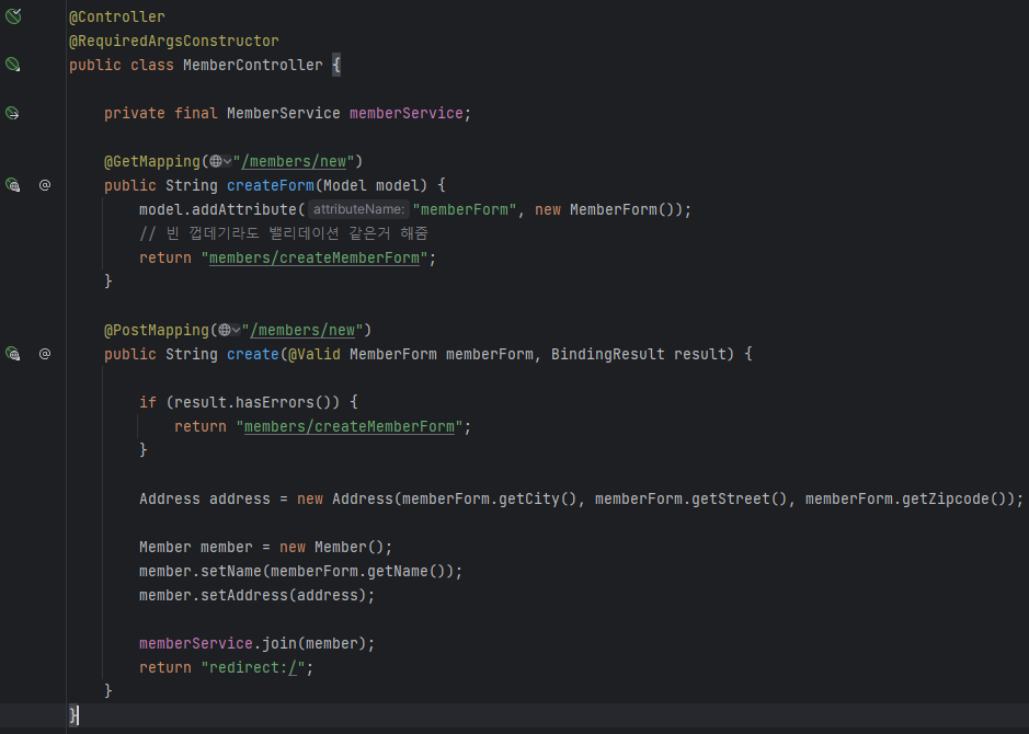 타임리프는 아니까 그냥 복습 겸... @Valid가 있으면 맞는지 검사하고 만약 바로 뒤의 매개변수로 bindingresult 있으면 에러 안띄우고 안에서 처리해서 다시 html에 넘길 수 있고 등..