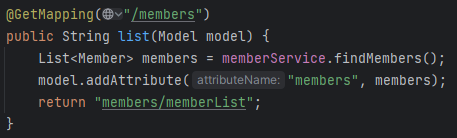 절대 주의할 점은 만약 api로 한다고 하면 저렇게 엔티티 자체를 그대로 넘기면 안된다. 지금은 실습이고 어차피 서버 사이드 렌더링이라 크게 상관 없어서 하는거지만. 하지만 서버 사이드 렌더링도 Dto를 만들어서 하는게 좋다.