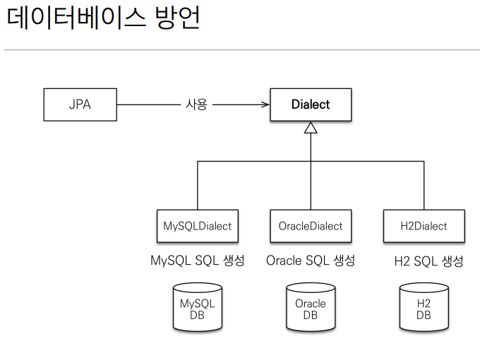 java persistence api인 인터페이스를 구체화한 게 hibernate이다. 그럼 각 db에 따라 각 언어마다 다른 방언이 있는데 그걸 hibernate가 구체화 해준다.