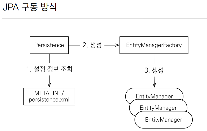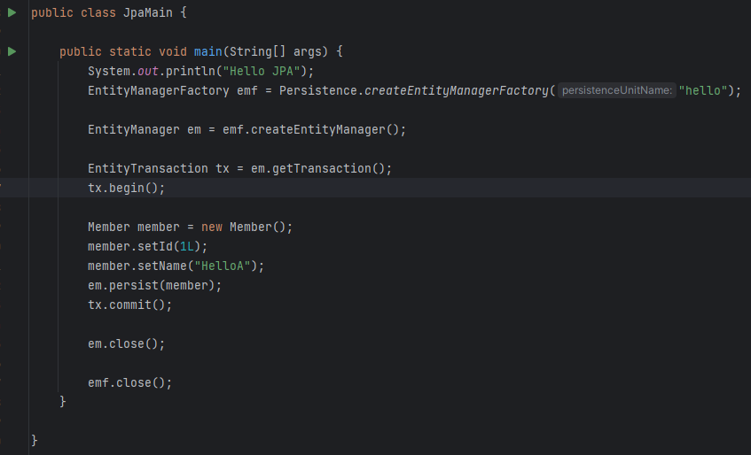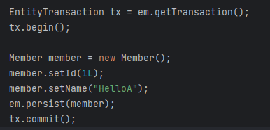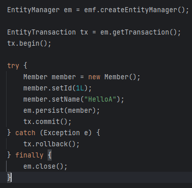 엔티티메니저 팩토리는 아까 META-INF/persistence.xml에서 정의한 persistence-unit 설정 정보 가지고 자신의 엔티티메니저 팩토리를 만든다. 이 팩토리는 처음에 로딩할 때, 앱 시작할 때 딱 한번 생성되고 이것만 가져다 쓸 거다. 트랜잭션이 필요할 때마다 이 팩토리에서 엔티티메니저를 만들고, 만들어진 엔티티메니저가 트랜잭션을 시작한다. 트랜젝션은 매우 중요하기 때문에 없으면 commit이 안되도록 만들어져있다.