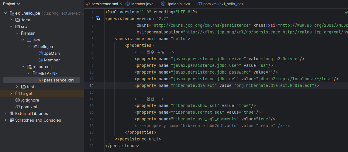 폴더 경로가 정해져 있어서 꼭 resources 바로 밑에 META-INF 밑에 persistence.xml로 파일명을 만들어야 한다. maven은 이걸로 db랑 연결한다.